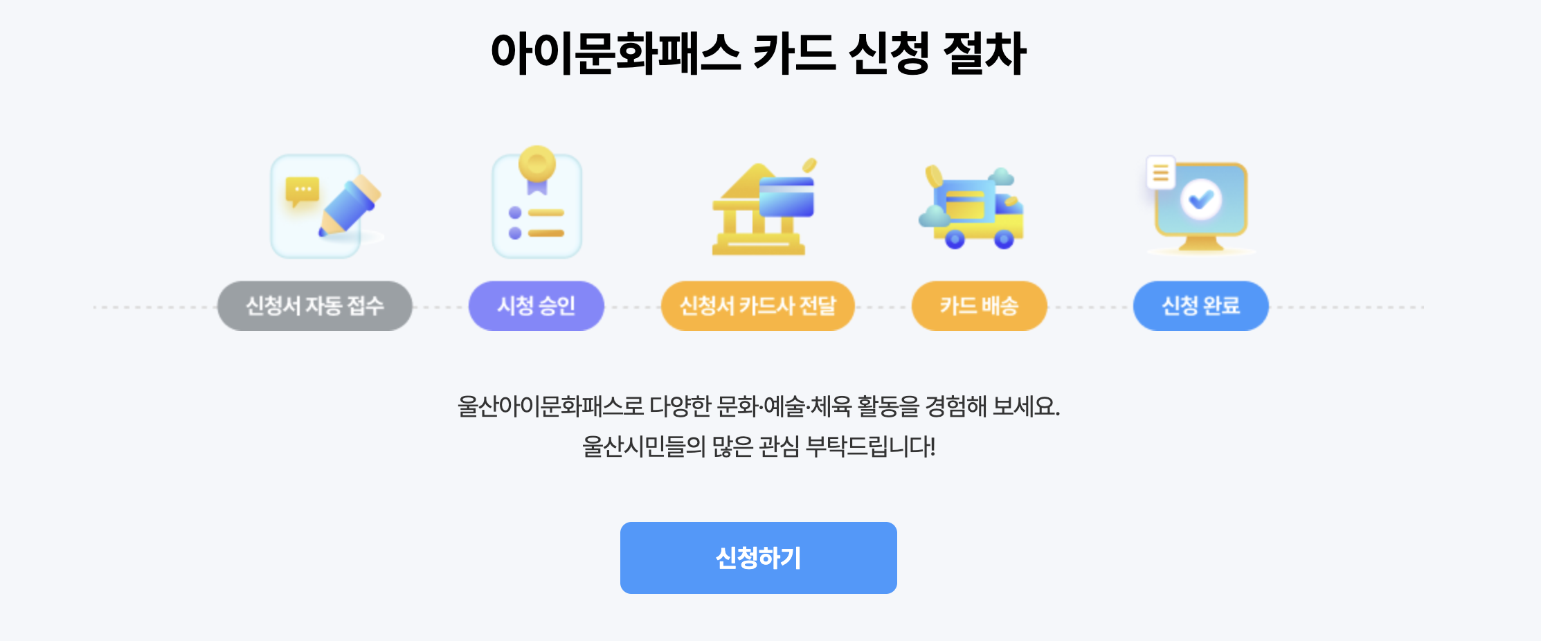 울산아이문화패스는 온라인과 오프라인 두 가지 방법으로 신청할 수 있습니다. 온라인 신청은 울산아이문화패스 공식 홈페이지를 통해 가능합니다. 보호자가 회원가입 후 본인 인증을 거치고, 자녀 정보를 입력하면 신청이 완료됩니다. 신청된 카드는 입력한 주소로 우편 발송되며, 수령 즉시 사용할 수 있습니다.