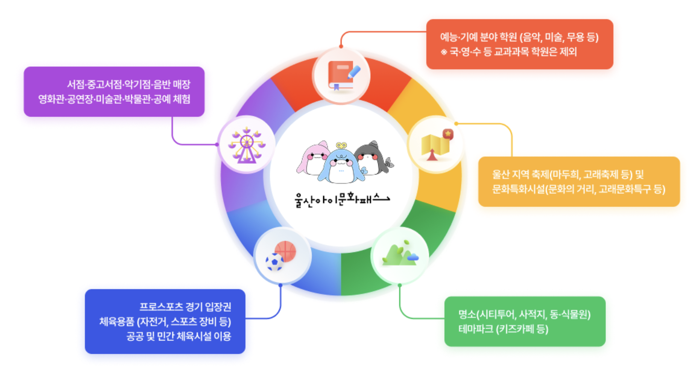울산아이문화패스를 통해 지급되는 금액은 연 1회, 1인당 10만 원 상당의 포인트입니다. 이 포인트는 전용카드 형태로 지급되며, 울산시와 제휴한 문화예술 관련 가맹점에서만 사용 가능합니다. 영화관, 공연장, 전시회, 서점 등 다양한 문화 공간에서 활용할 수 있어 아동의 문화 체험 폭을 넓히는 데 기여합니다.