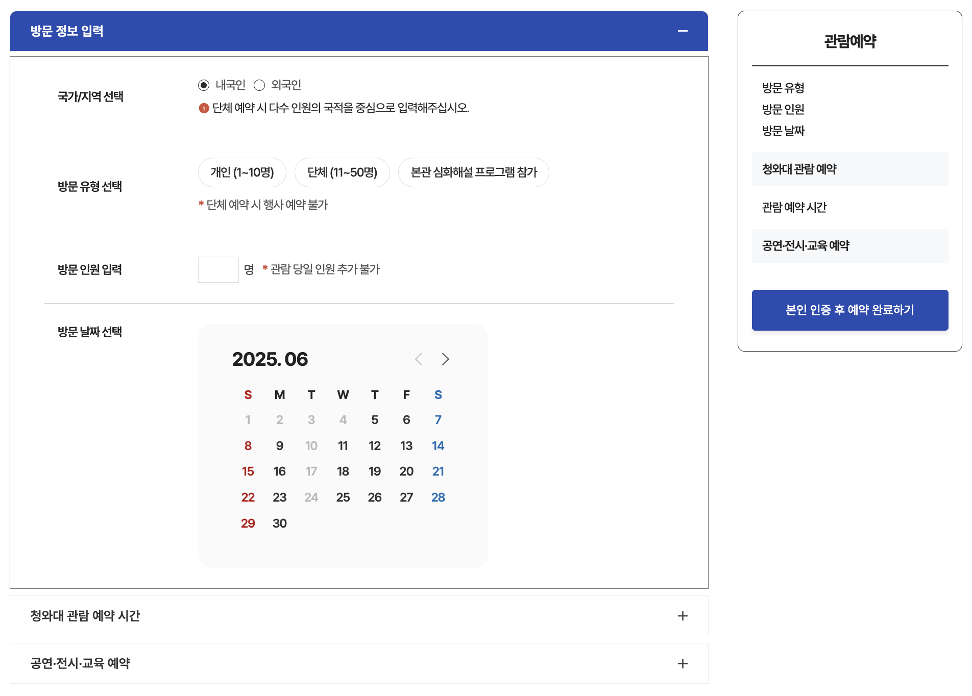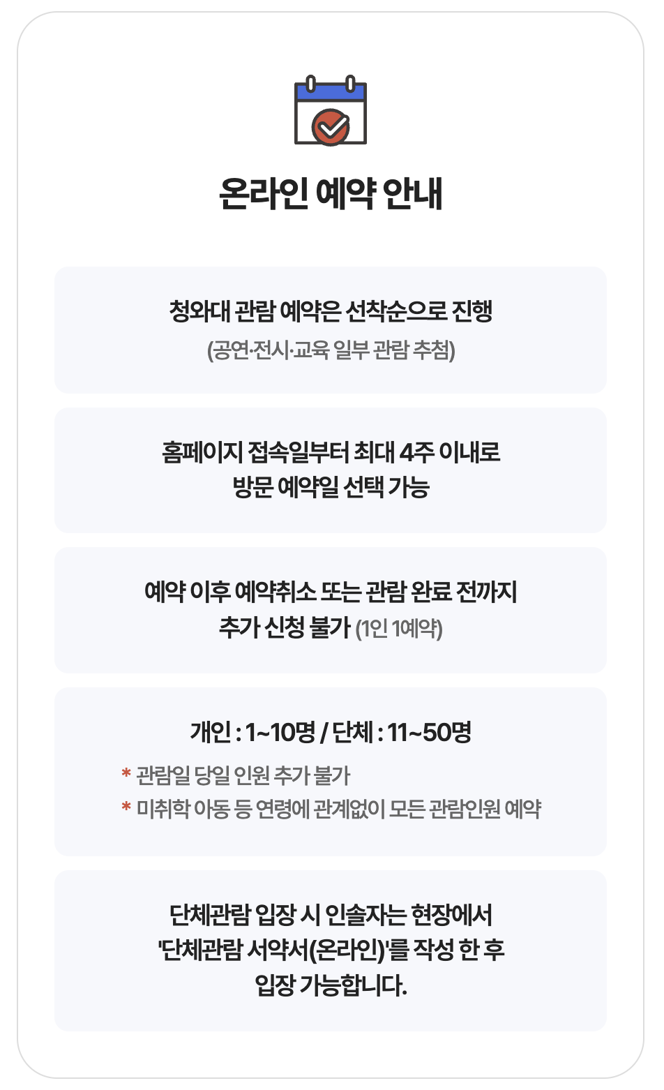 - 예약 사이트 접속: 청와대 관람 예약 페이지에 접속합니다.