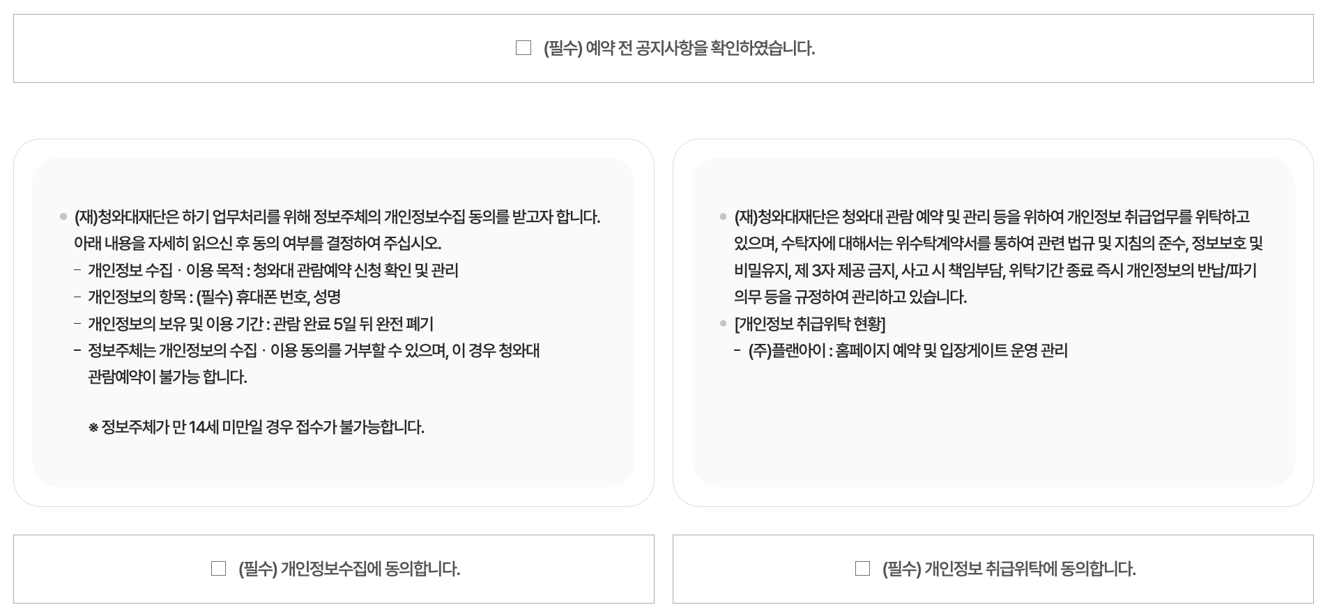 - 이용안내 및 동의 : 관람 시 유의사항 및 예약 공지사항을 확인한 후, 개인정보 수집 및 이용에 대한 동의 절차를 진행합니다.