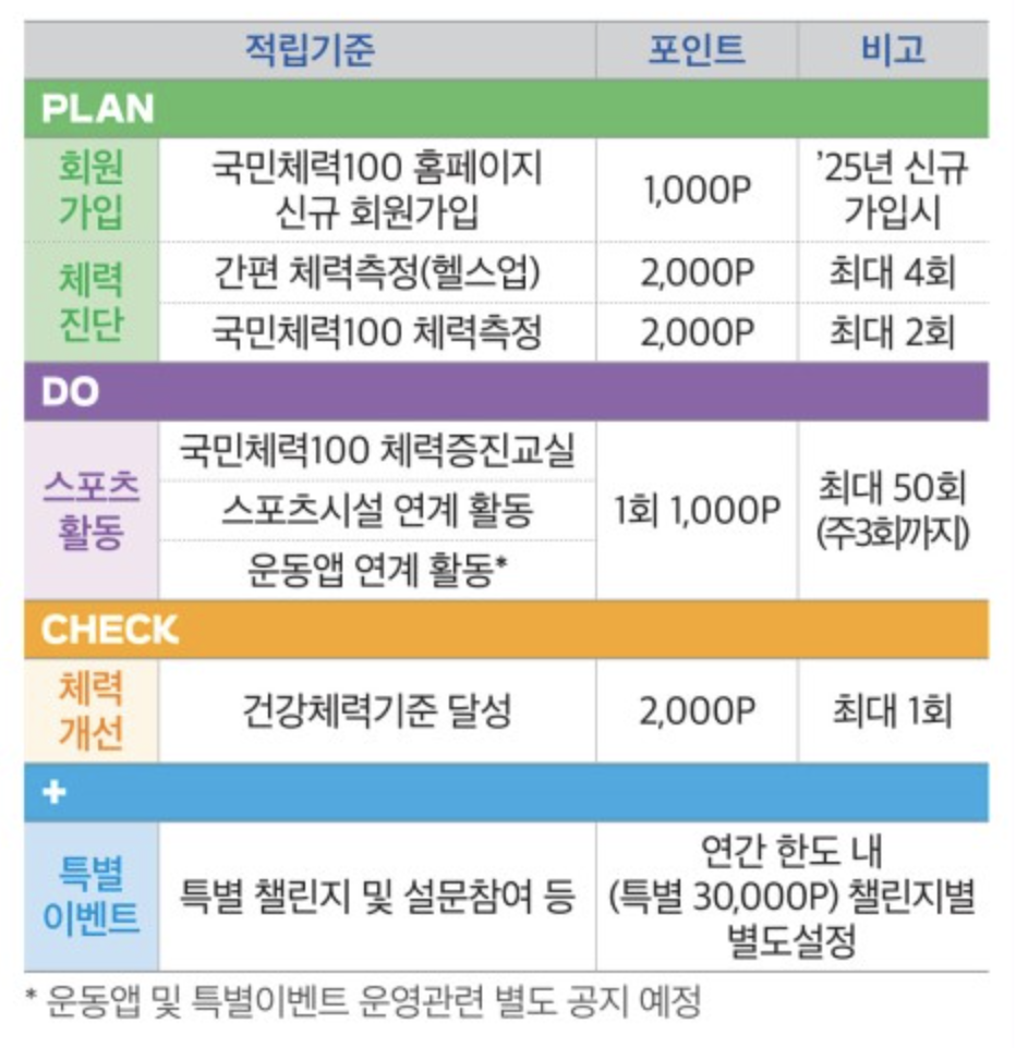 - 📌 적립한도 : 연간 최대 5만P (회원가입, 체력진단, 스포츠활동 통합), 특별이벤트는 별도한도 적용