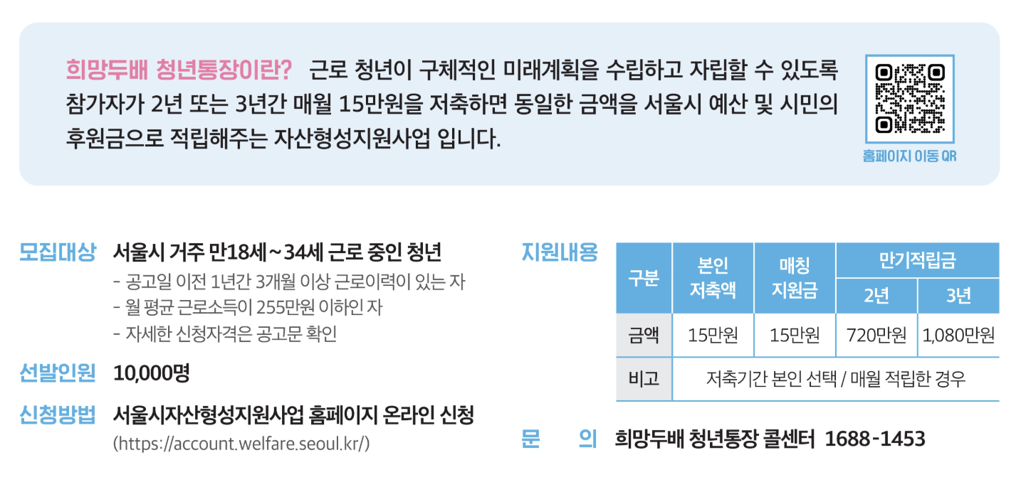 ‘희망두배 청년통장’은 서울시가 서울 거주 청년들의 자산 형성을 지원하기 위해 만든 매칭 저축 제도입니다. 청년이 매달 일정 금액을 저축하면, 서울시가 동일한 금액을 추가 적립해주는 방식으로, 자산 형성과 동시에 재정 교육, 금융 상담도 함께 제공되는 종합적인 청년 지원 사업이에요.