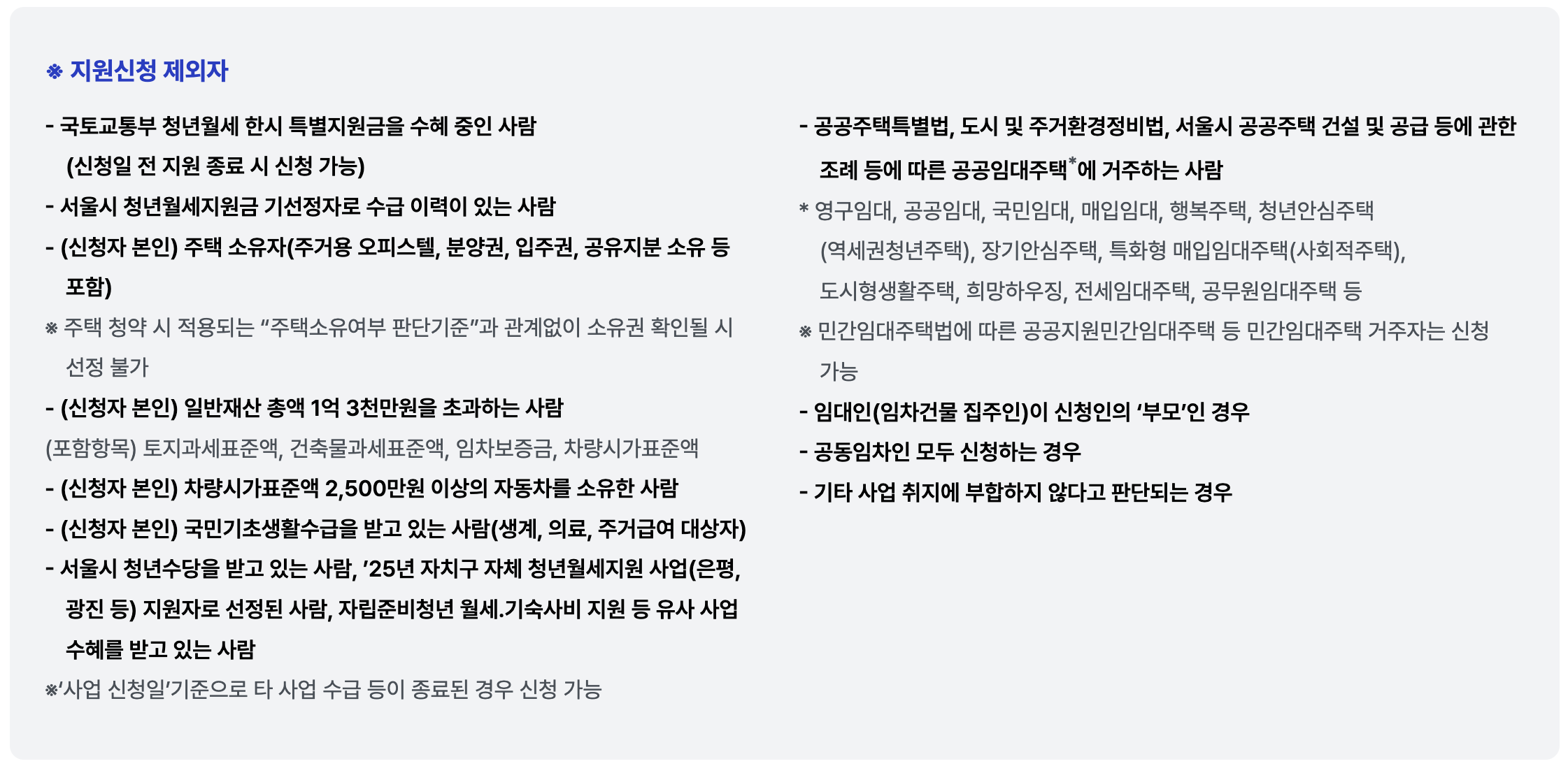※’25년 이전 서울시 청년월세지원 기 선정(수급)자, 국토교통부 청년월세 한시 특별지원금을 수혜중인 사람 및 ’25년 은평·광진 등 자치구 청년월세 지원자로 선정된 사람은 지원 불가