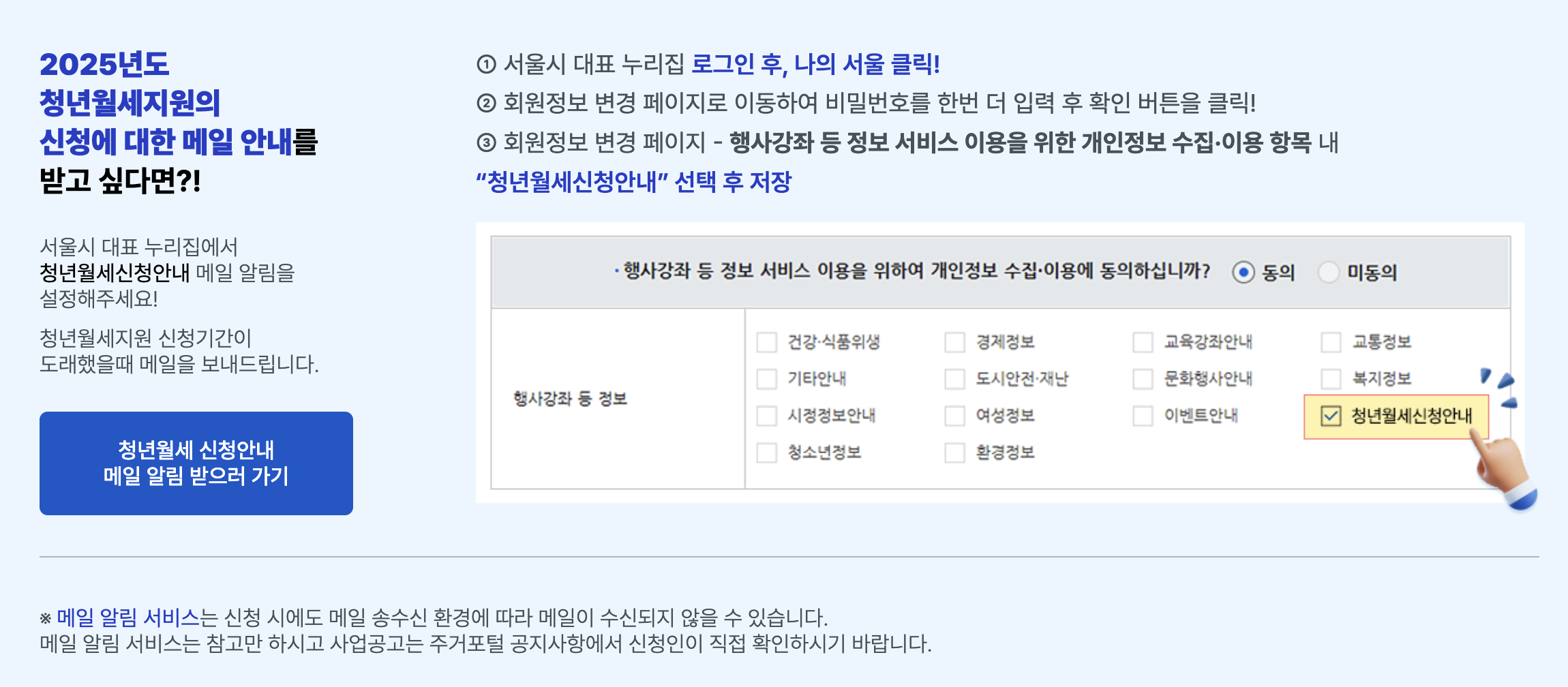 - 신청 방법: 서울주거포털 내 ‘청년월세지원’란에서 지원 신청 후 마이페이지에서 신청 확인