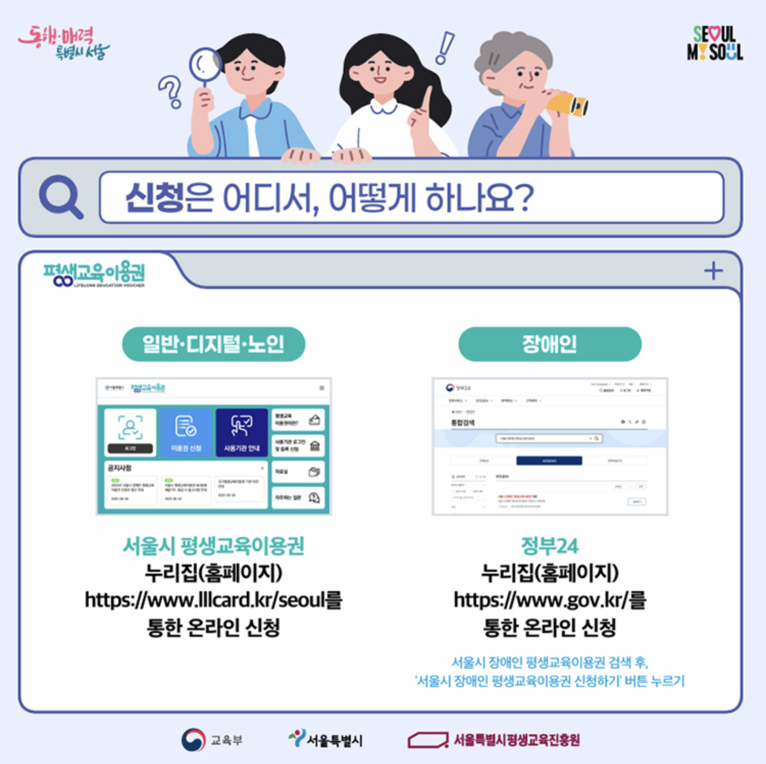 - 일반/디지털/노인 이용권: 서울시 평생교육이용권 누리집 접속 → 온라인 신청