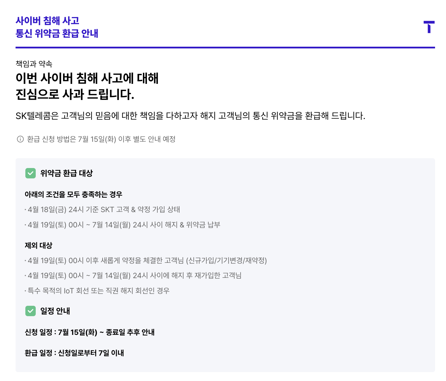 이번 SKT 위약금 환급은 대규모 해킹 사건으로 인한 고객 불편을 해소하기 위한 특별 조치입니다.