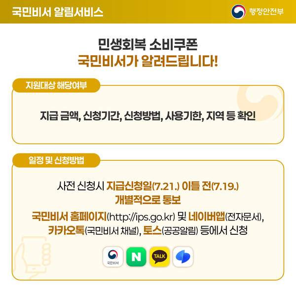 지급 대상 여부와 금액은 ‘민생회복 소비쿠폰 알림서비스’를 통해 개별 안내되며, 해당 서비스는 국민비서 홈페이지, 네이버 앱(전자문서), 카카오톡(국민비서 채널), 토스(공공알림)을 통해 사전 신청해야 수신할 수 있습니다.