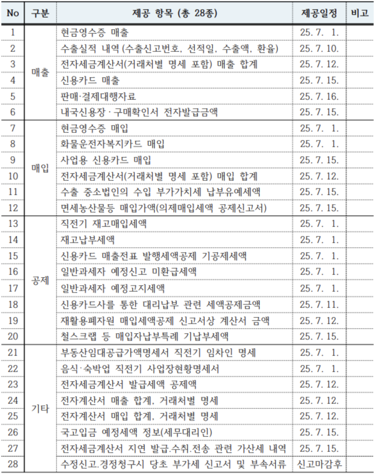 이 서비스는 전자세금계산서, 신용카드, 현금영수증 등 항목별로 제공 일정이 달라 순차적으로 확인해야 합니다.