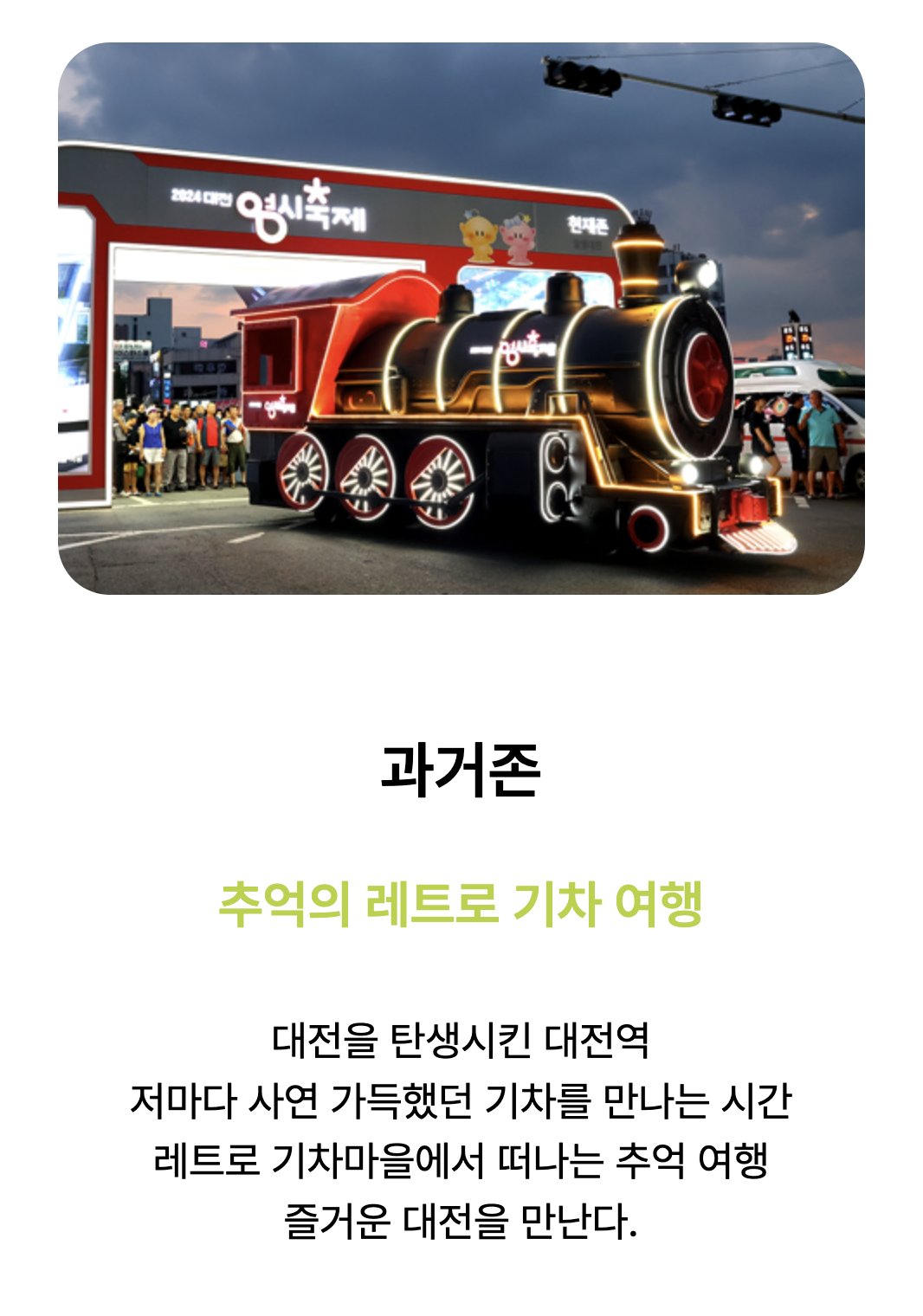 - 장소: 대전역 ↔ 옛충남도청 중앙로 일대 (차 없는 거리 운영)