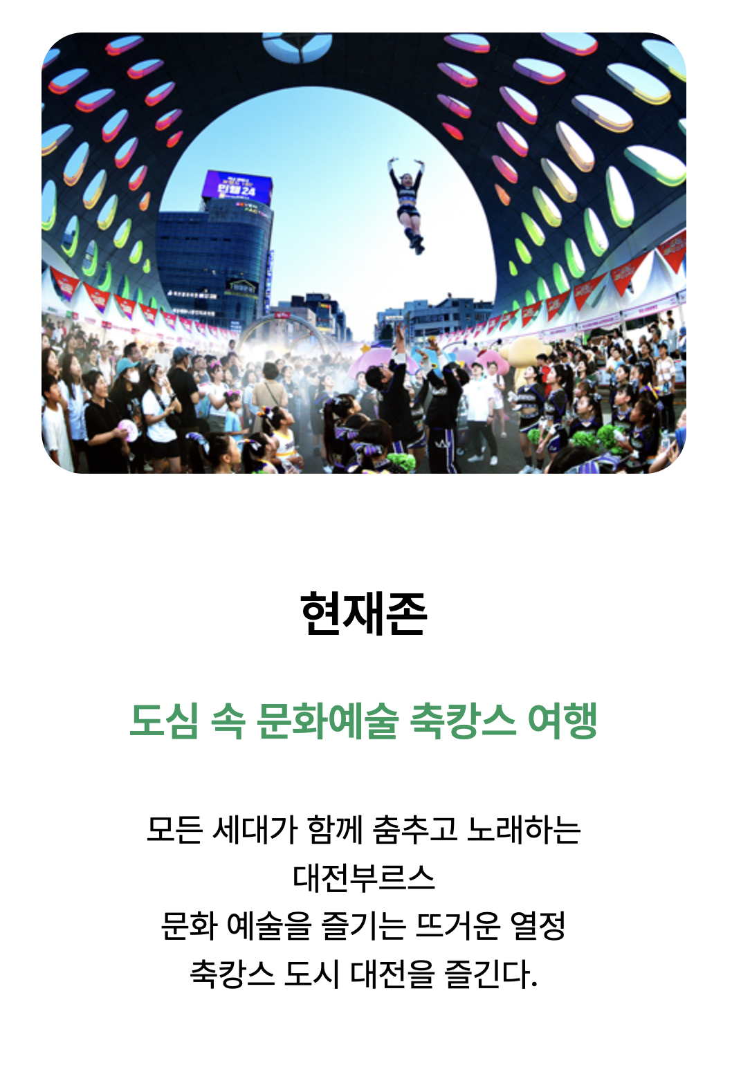 길거리 공연, 스트리트 댄스, 라이브 페인팅 등 대전의 현재를 대표하는 문화·예술 콘텐츠를 한자리에서 즐길 수 있습니다.